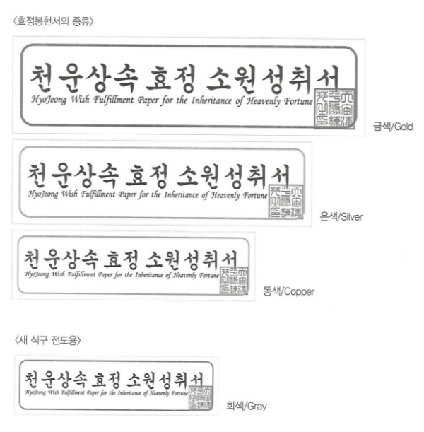 효정봉헌서는 한국과 국제 축복가정(수련원)의 경우 금색, 은색, 동색, 회색이 있으며, 특히 한국은 새 식구 전도용으로 회색 효정봉헌서가 있다. 일본(수련원)은 금, 은, 동 세 가지가 있다.